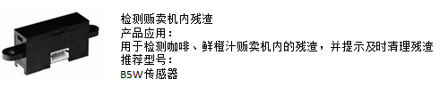 (5)產(chǎn)品推廣五:檢測(cè)販賣機(jī)內(nèi)殘?jiān)扑]使用歐姆龍B5W傳感器,用于檢測(cè)咖啡、鮮橙汁販賣機(jī)內(nèi)的殘?jiān)⑻崾炯皶r(shí)清理殘?jiān)?/span>