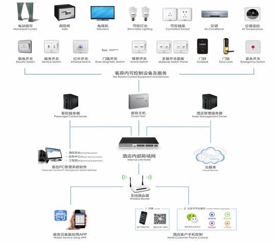 客房智能控制主機(jī)、客房控制面板和客房管理軟件三部分組成客房智能控制系統(tǒng),并可以根據(jù)客戶需求自由組合和擴(kuò)展模塊。通過弱電控制強(qiáng)電的方式,實(shí)現(xiàn)對(duì)照明、排氣扇、空調(diào)、窗簾、音視頻及服務(wù)信息等功能控制。采用TCP/IP協(xié)議或CAN-BUS總線組網(wǎng),能夠?qū)崿F(xiàn)遠(yuǎn)程管理與控制,還可以與蘋果(IOS)、安卓(Android)系統(tǒng)的移動(dòng)終端設(shè)備無縫連接,可由移動(dòng)終端設(shè)備進(jìn)行控制,為客房營造典雅、溫馨、舒適的環(huán)境,實(shí)現(xiàn)酒店的智能控制、綠色環(huán)保和高效管理。