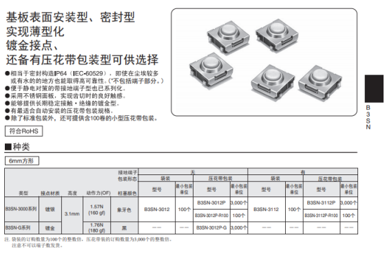 歐姆龍的輕觸開關普遍應用在電動牙刷,輕觸開關適合高密度表面貼裝,有的焊接后可清洗,密封型可防塵,最適合惡劣環(huán)境選用,電路設計簡單。產品壽命10萬~1000萬次不等。