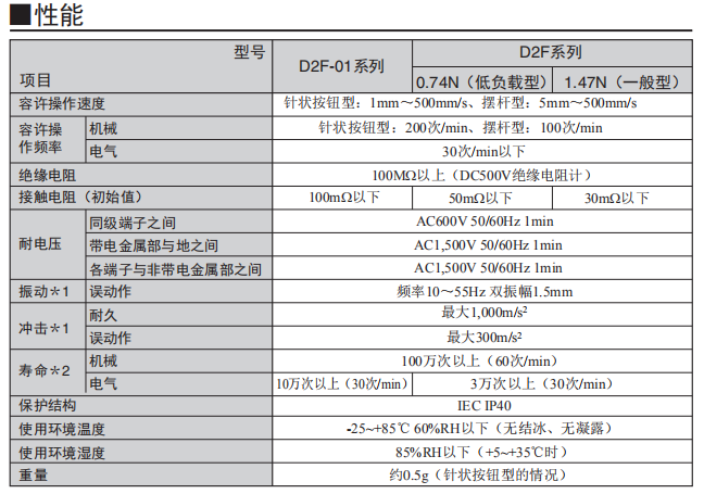 歐姆龍微動(dòng)開(kāi)關(guān)D2F系列產(chǎn)品性能: