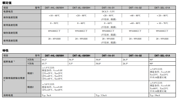 MEMS非接觸式溫度傳感器的額定值/特性: