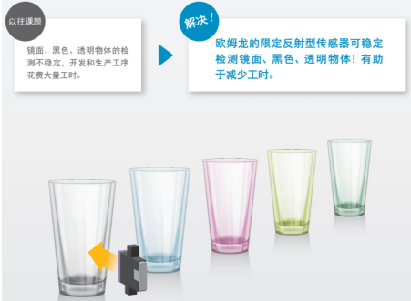 歐姆龍限定反射傳感器B5W-LB穩定檢測鏡面、黑色及透明物體等各種物體。限定反射型傳感器的原理,接受來自檢測物體的反射光以檢測物體有無,擁有限定了投光光束和受光區域的光學系統,僅可檢測相距傳感器一定距離(投光光束與受光區域重合的范圍)的檢測物體。不受背影影響,切實檢測希望檢測的物體。鏡面、黑色、透明物體的檢測不穩定,開發和生產工序花費大量工時。而歐姆龍限定反射型傳感器可穩定檢測鏡面、黑色、透明物體,有助于減少工時。