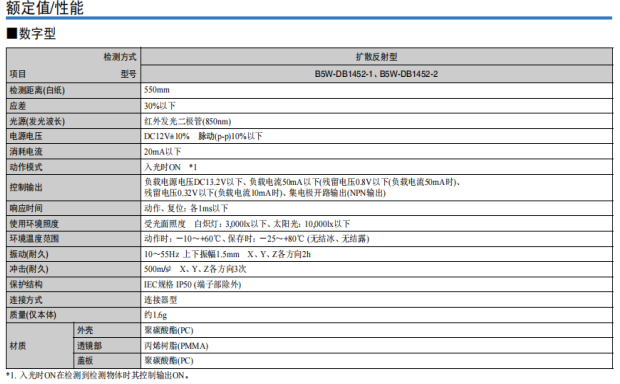 歐姆龍B5W-DB采用集電極(NPN)開路輸出,電源電壓DC12V,消耗電流可達到20mA以下,即使在較低的功耗下,也可實現高性能。并且與同類產品相比,B5W-DB不易受到環境光的影響。
