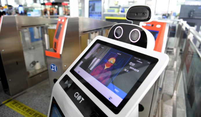 下圖為測(cè)溫機(jī)器人在工作,可實(shí)現(xiàn)熱成像檢測(cè):