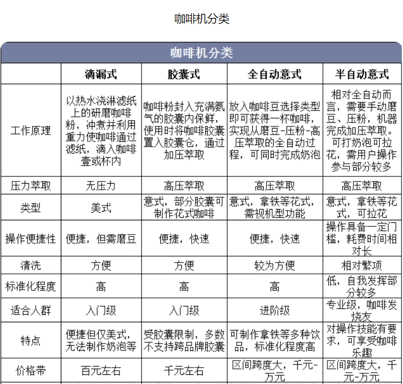 人們把電子技術(shù)應(yīng)用到咖啡機上,實現(xiàn)了磨粉、壓粉、裝粉、沖泡、清除等釀制咖啡全過程的自動控制,創(chuàng)造了咖啡機。具體分品類來看,咖啡機根據(jù)萃取方式可主要分為滴漏式、膠囊式和壓力式(意式),根據(jù)工作方式可分為全自動和半自動(區(qū)別在于半自動需要消費者掌握一定的咖啡技能,磨豆、壓粉、打奶泡等多項步驟需手動參與)。