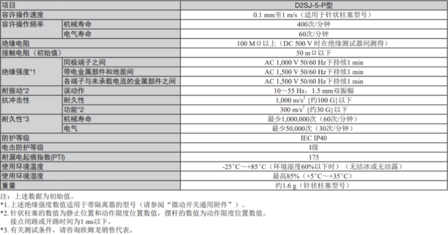 歐姆龍D2SJ擁有19.8mm×6.4mm×10.2mm的超小型封裝,和封密型輕觸開關一樣,歐姆龍D2SJ采用了防塵、防水措施,能夠在-25℃~+85℃(濕度環境60%以下)等環境惡劣中也保持較高的性能。除此之外,在環境溫度20±2℃ 、環境濕度65±5%RH、操作頻率30次/min的情況下,歐姆龍D2SJ最大可達250V的額定電壓,5A的阻性負載,適用于更廣泛的產品。
